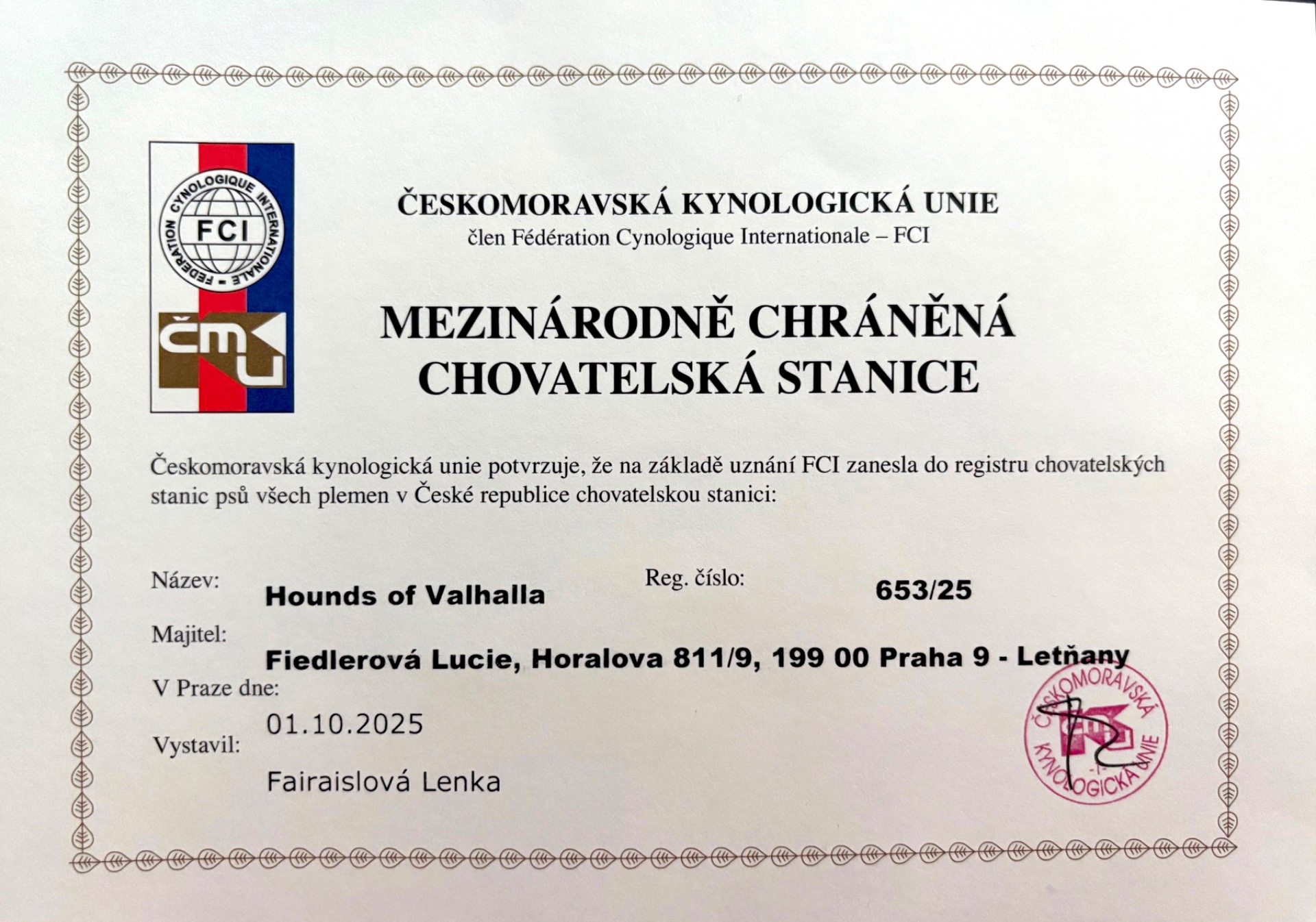 Naším pilířem je teď Lagertha (Igraine Cernunnos Mawr) – naše "vikingská bojovnice" s něžnou duší a neuvěřitelně vyrovnanou povahou. Vyniká nejen svým exteriérem, který zdědila po velmi úspěšných rodičích, ale je to i velmi chytrá fenka s velkou radostí do života. Právě Lagertha se stala zakladatelkou naší chovatelské stanice Hounds of Valhalla, jejíž název symbolizuje sílu, odvahu a věrnost.